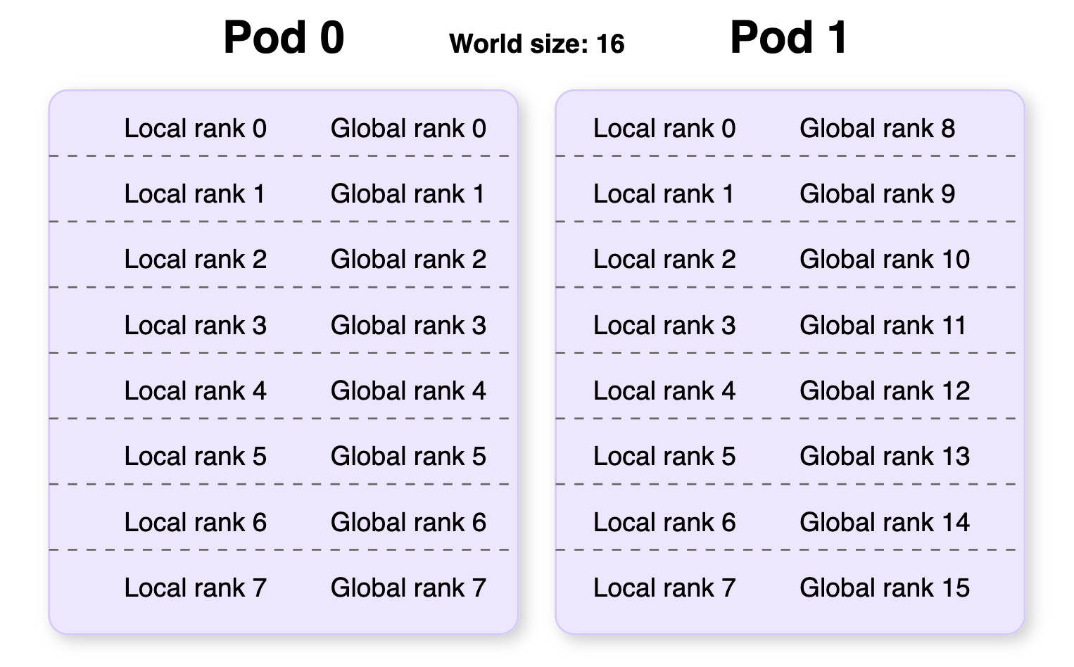 0 to WORLD_SIZE-1 (WORLD_SIZE = the total number of GPUs in the cluster). In our example there are two Bnodes of eight GPUs, so the global rank spans from 0-15. The second number is the local rank, which defines the order of GPUs within a single Bnode (0-7 for this example).