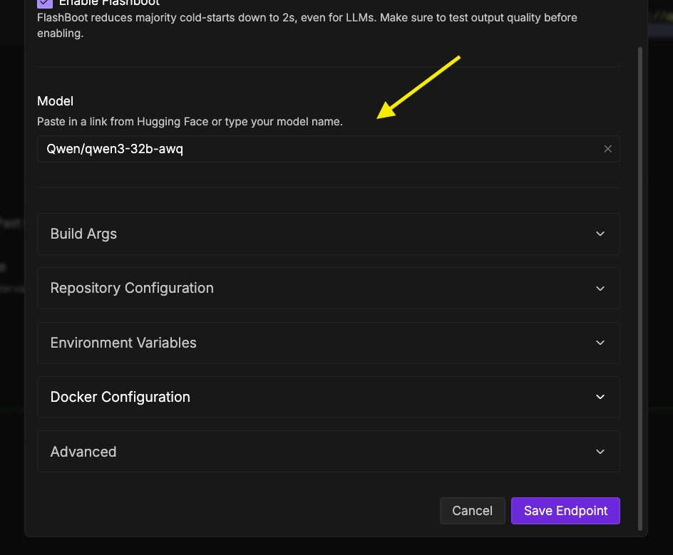 In the Endpoint Configuration step, scroll down to Model (optional) and add the link for the model you want to use.For example,